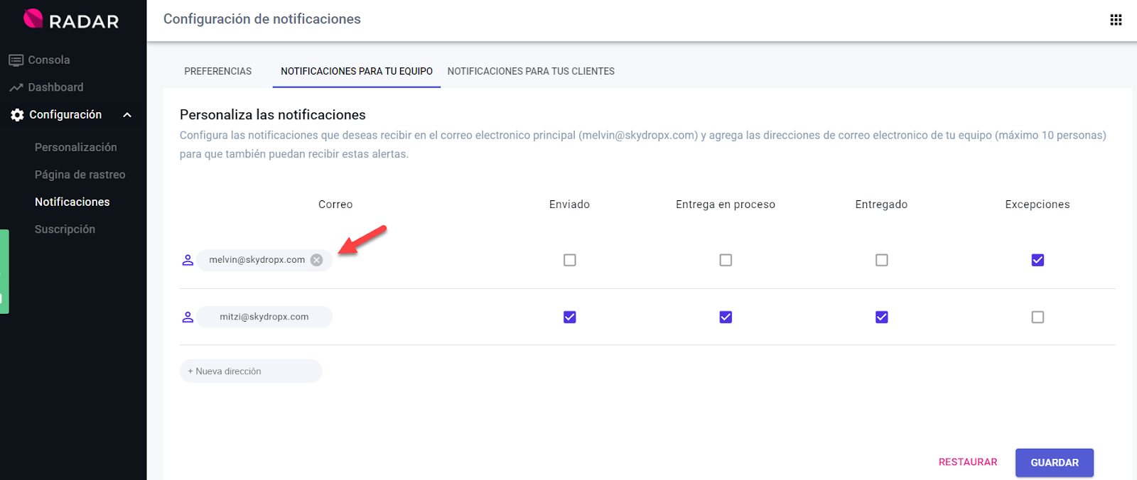 3. Da click en la “X” en la persona o correo electrónico que deseas que ya no reciba las notificaciones.