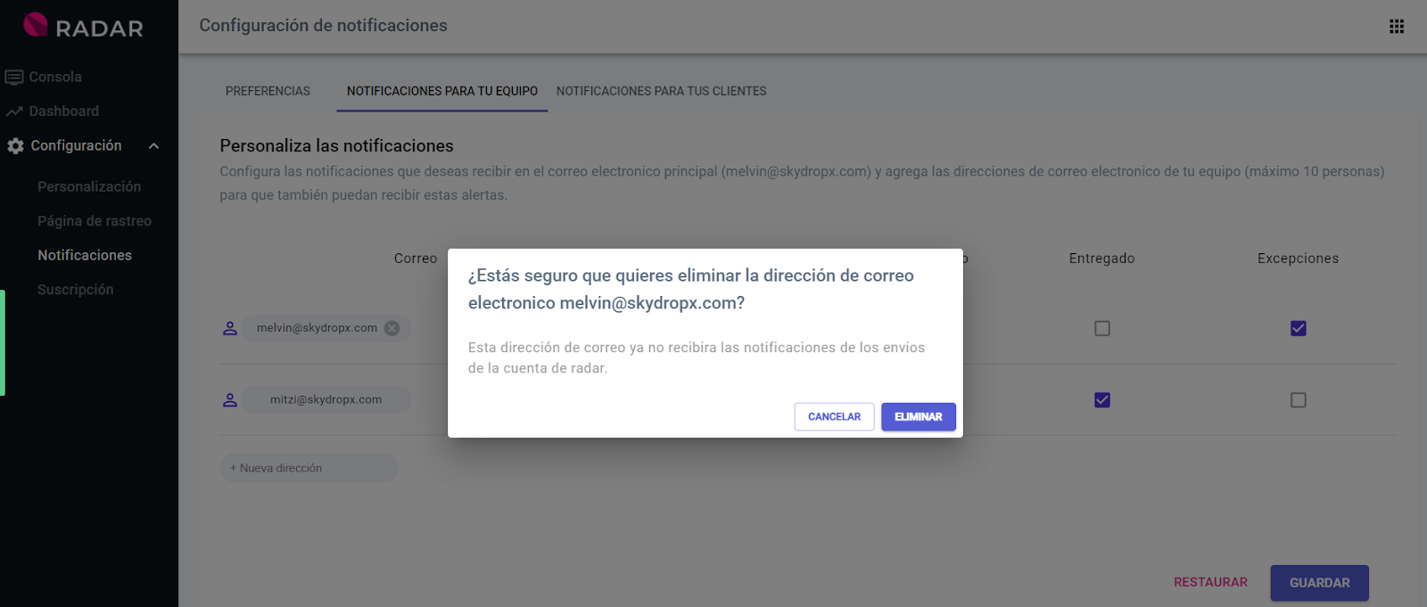 Si por algún motivo deseas que una persona o correo electrónico ya no reciba las notificaciones debes de realizar los siguientes pasos: