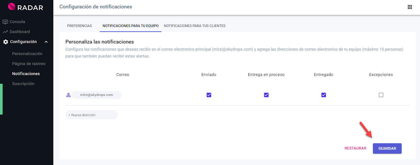 La función Notificaciones múltiples te permite enviar las notificaciones que tú, como administrador o como dueño del negocio, recibes de cada uno de los envíos a alguien de tu equipo.